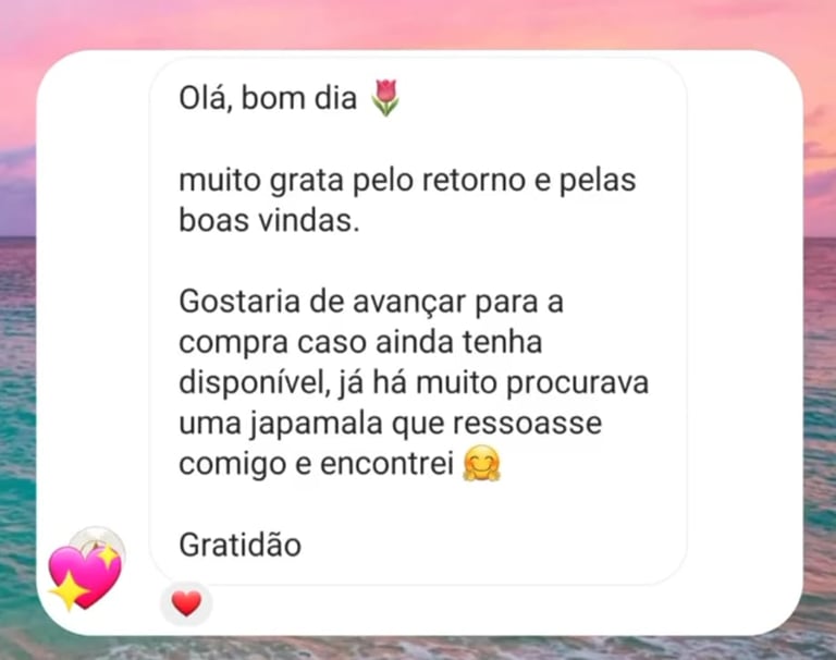 Estou aqui para guiar-te na escolha dos materiais, das pedras e dos elementos que irão compor a tua peça especial e única. Juntas, vamos criar um Japamala que seja um reflexo autêntico do teu ser e uma fonte de inspiração diária.